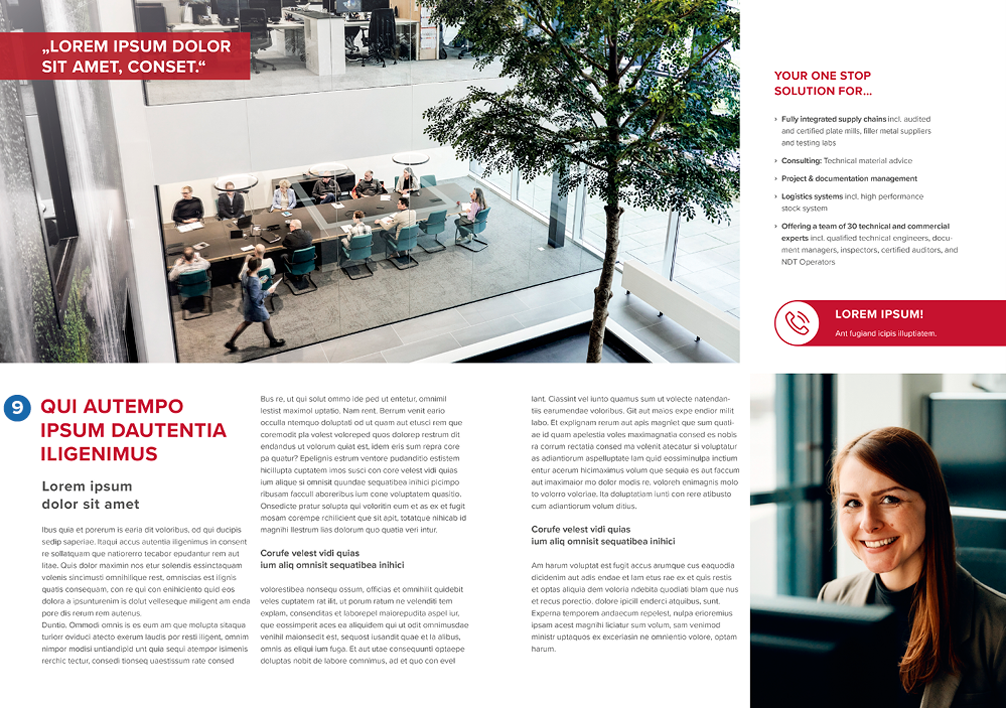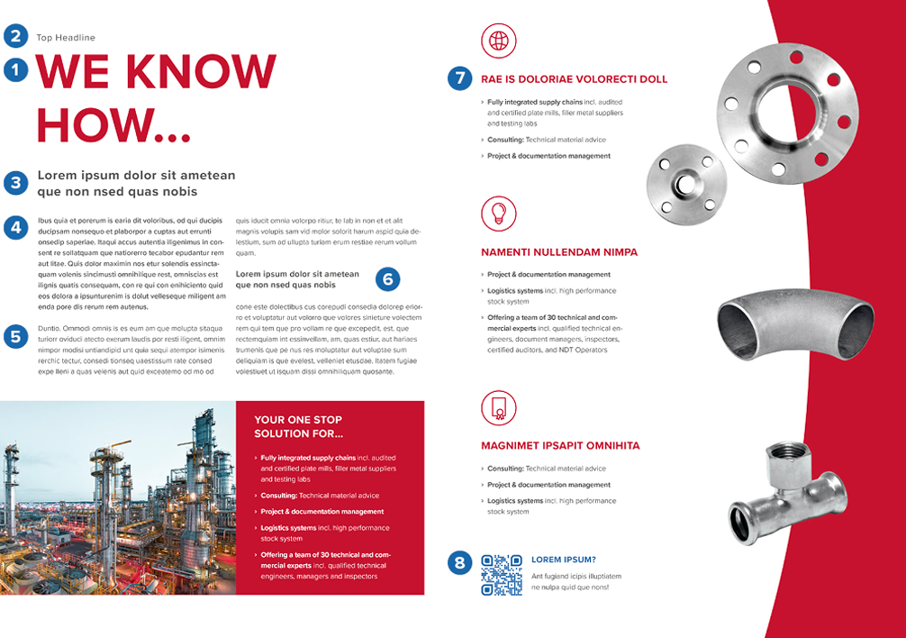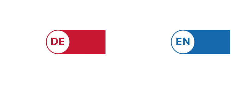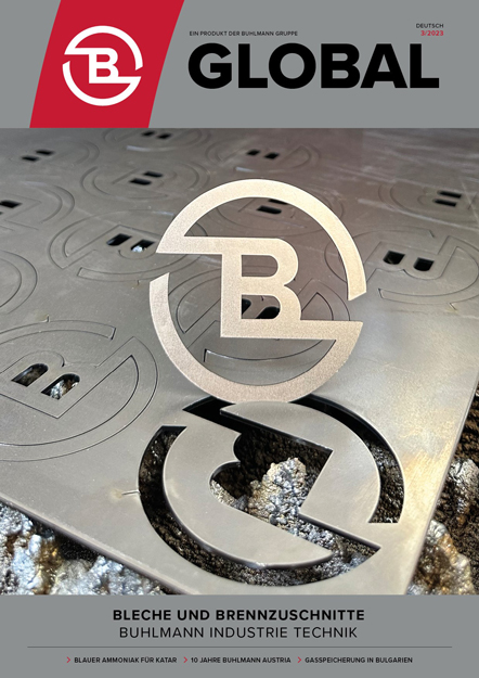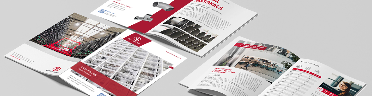 Das Kundenmagazin B global und Mitarbeitermagazin B together erscheinen als Wendebroschüre – Deutsch in Rot, Englisch in Blau.
