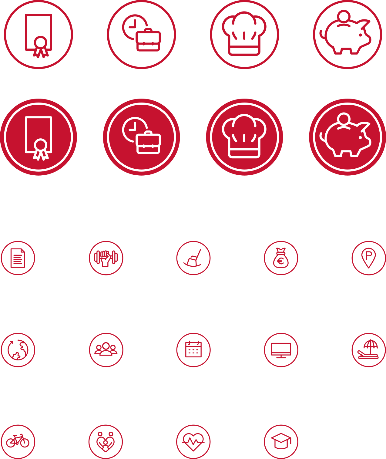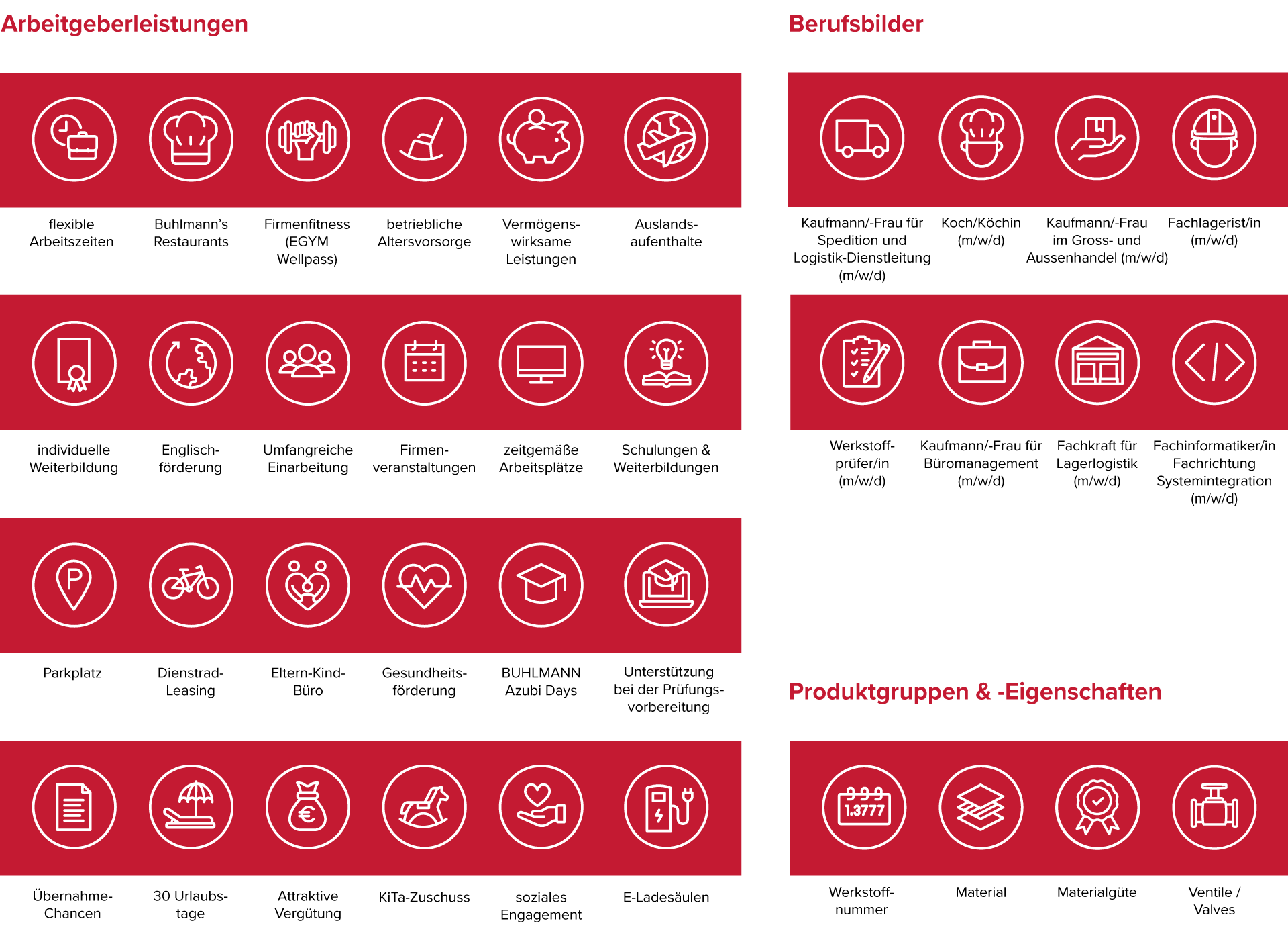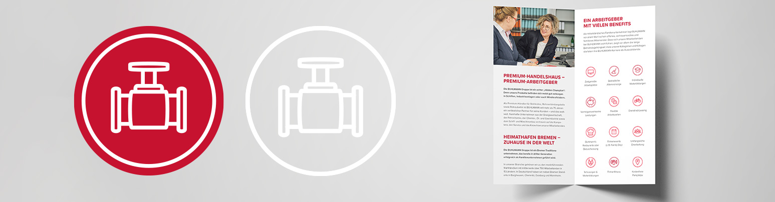 BUHLMANN legt auch bei der Auswahl von Icons Wert auf Einheitlichkeit. Sie bestehen ausschließlich aus Konturen in Unternehmensfarbe. Dabei ist darauf zu achten, dass sie nicht zu komplex sind und gut erkennbar. Auf Schattierungen oder sonstige Effekte wird verzichtet.
