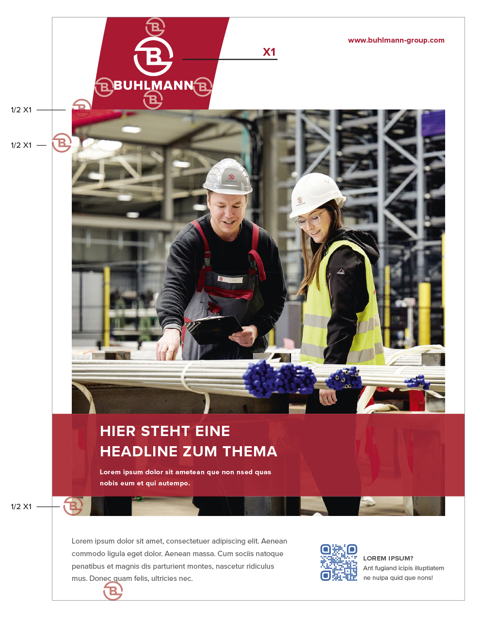 If the arc is combined with an image, it is used as a shortened "flag". The height of the arc is aligned with the bottom edge of the image. The BUHLMANN logo is placed in the centre of the arc with the following margins: