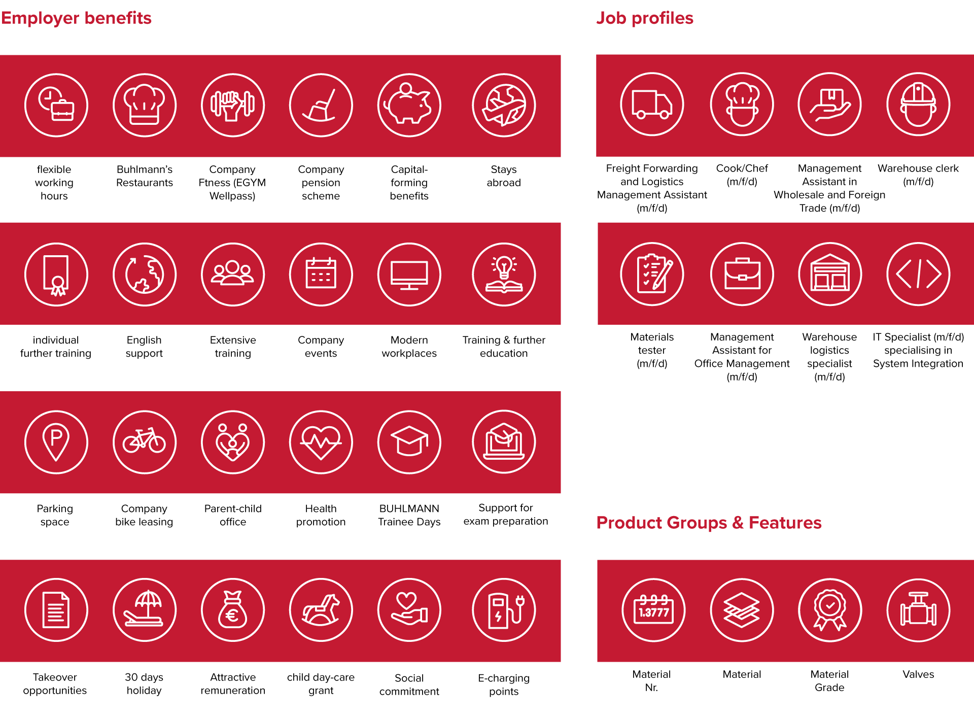 Uniformity is also important to BUHLMANN when it comes to choosing icons. They must consist exclusively of outlines in the corporate colour. They should also not be too complex and easy to make out. Shading or other effects must not be used.